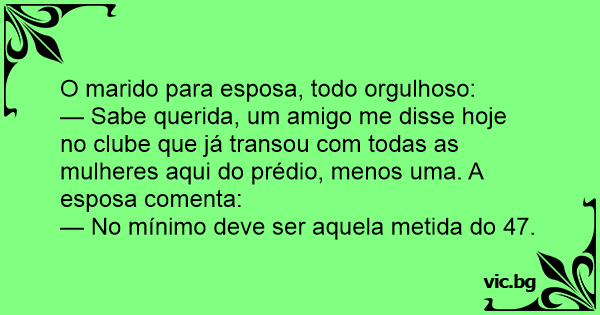— Sabe querida, um amigo me disse hoje no clube que já transou com todas as mulheres aqui do prédio, menos uma. A esposa comenta: