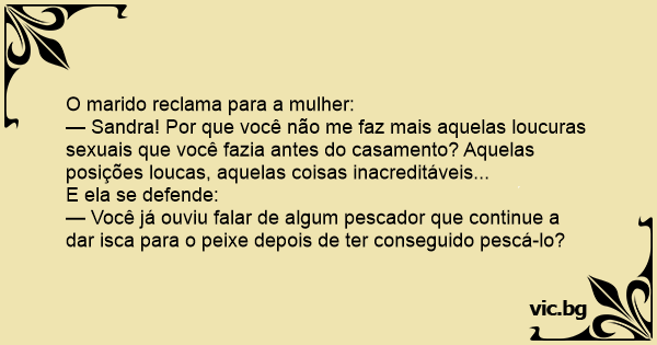 — Sandra! Por que você não me faz mais aquelas loucuras sexuais que você fazia antes do casamento? Aquelas posições loucas, aquelas coisas inacreditáveis...