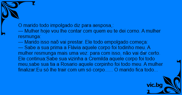 — Sabe a sua prima a Flávia aquele corpo foi todinho meu. A mulher resmunga mais uma vez: para com isso, não vai dar certo. Ele continua:Sabe sua vizinha a Cremilda aquele corpo foi todo meu,sabe sua tia a Rosario aquele corpinho foi todo meu. A mulher finalizar:Eu só lhe trair com um só corpo...... O marido fiса todo empolgado foi traido uma só vez. A mulher completa,tá vendo aquele corpo de bombeiros ali, aquele corpo foi todinho meu.