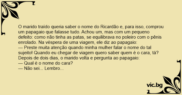 O marido traído queria saber o nome do Ricardão e, para isso, comprou um papagaio que falasse tudo. Achou um, mas com um pequeno defeito: como não tinha as patas, se equilibrava no poleiro com o pênis enrolado. Na véspera de uma viagem, ele diz ao papagaio: