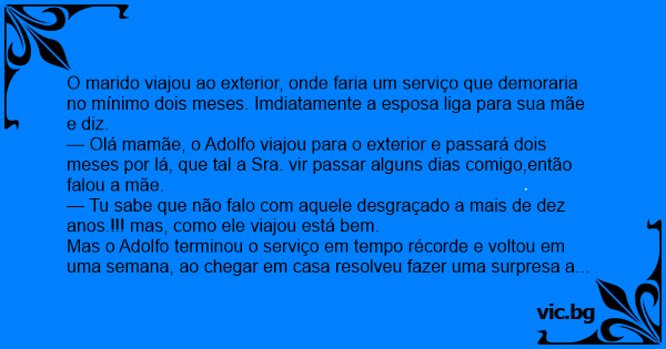 — Olá mamãe, o Adolfo viajou para o exterior e passará dois meses por lá, que tal a Sra. vir passar alguns dias comigo,então falou a mãe.