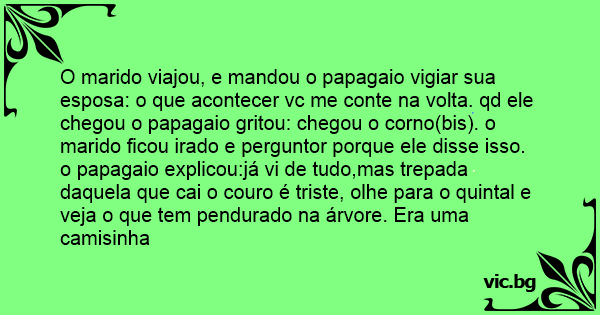 O marido viajou, e mandou o papagaio vigiar sua esposa: o que acontecer vc me conte na volta. qd ele chegou o papagaio gritou: chegou o соrnо(bis). o marido ficou irado e perguntor porque ele disse isso. o papagaio explicou:já vi de tudo,mas trepada daquela que cai o couro é triste, olhe para o quintal e veja o que tem pendurado na árvore. Era uma camisinha