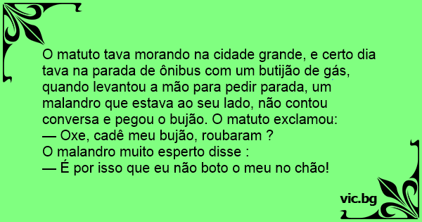O matuto tava morando na cidade grande, e certo dia tava na parada de ônibus com um butijão de gás, quando levantou a mão para pedir parada, um malandro que estava ao seu lado, não contou conversa e pegou o bujão. O matuto exclamou: