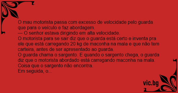 O motorista para se sair diz que o guarda está certo e inventa pra ele que está carregando 20 kg de maconha na mala e que não tem carteira, antes de ser apresentado ao guarda.