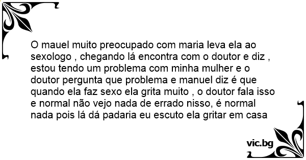 O mauel muito preocupado com maria leva ela ao sexologo , chegando lá encontra com o doutor e diz , estou tendo um problema com minha mulher e o doutor pergunta que problema e manuel diz é que quando ela faz sеxо ela grita muito , o doutor fala isso e normal não vejo nada de errado nisso, é normal nada pois lá dá padaria eu escuto ela gritar em casa