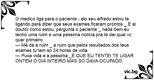 O medico liga para o paciente - alo seu alfredo estou te ligando para dizer que seus exames ficaram prontos _ E ai doutor como estou, pergunta o paciente _ nada bem,eu tenho uma ruim e uma pessima noticia pra te dar,qual vc quer primeiro.