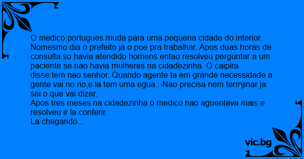 O medico portugues muda para uma pequena cidade do interior. Nomesmo dia o prefeito ja o poe pra trabalhar. Apos duas horas de consulta so havia atendido homens entao resolveu perguntar a um paciente se nao havia mulheres na cidadezinha. O caipira disse:tem nao senhor. Quando agente ta em grande necessidade a gente vai no rio,e la tem uma egua..-Nao precisa nem termjinar ja sei o que vai dizer.