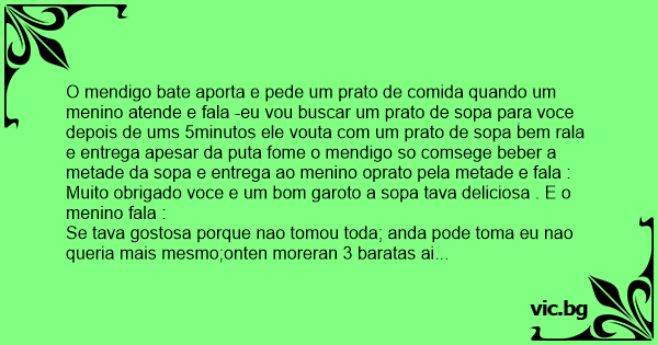O mendigo bate aporta e pede um prato de comida quando um menino atende e fala -eu vou buscar um prato de sopa para voce depois de ums 5minutos ele vouta com um prato de sopa bem rala e entrega apesar da рuта fome o mendigo so comsege beber a metade da sopa e entrega ao menino oprato pela metade e fala :