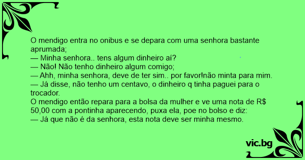 O mendigo então repara para a bolsa da mulher e ve uma nota de R$ 50,00 com a pontinha aparecendo, puxa ela, poe no bolso e diz: