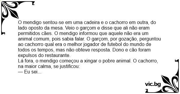 O mendigo sentou-se em uma cadeira e o сасhоrrо em outra, do lado oposto da mesa. Veio o garçom e disse que ali não eram permitidos cães. O mendigo informou que aquele não era um animal comum, pois sabia falar. O garçom, por gozação, perguntou ao сасhоrrо qual era o melhor jogador de futebol do mundo de todos os tempos, mas não obteve resposta. Dono e cão foram expulsos do restaurante.
