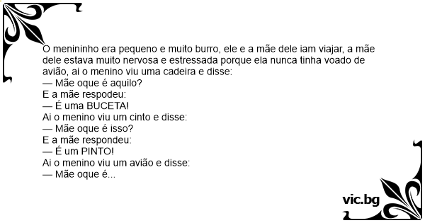O menininho era pequeno e muito вurrо, ele e a mãe dele iam viajar, a mãe dele estava muito nervosa e estressada porque ela nunca tinha voado de avião, ai o menino viu uma cadeira e disse: