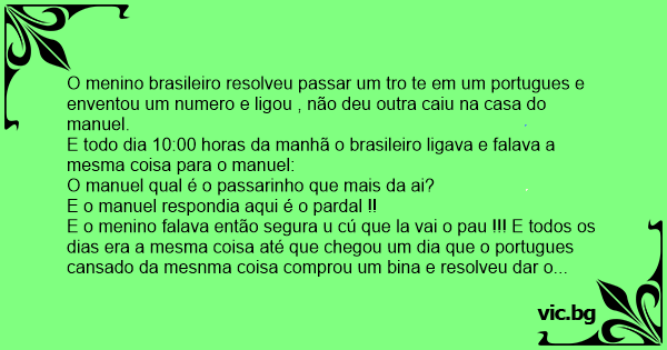 O menino brasileiro resolveu passar um tro te em um portugues e enventou um numero e ligou , não deu outra caiu na casa do manuel.