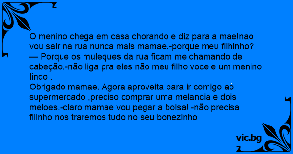 O menino chega em casa chorando e diz para a mae!nao vou sair na rua nunca mais mamae.-porque meu filhinho?