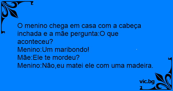 O menino chega em casa com a cabeça inchada e a mãe pergunta:O que aconteceu?