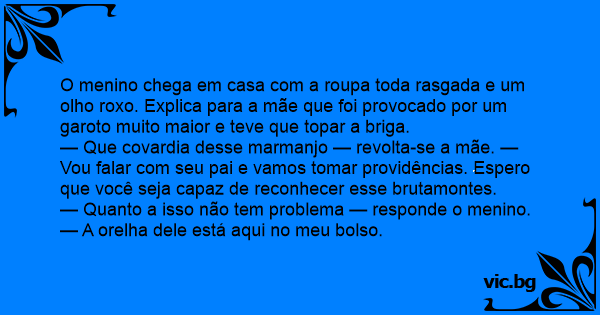 O menino chega em casa com a roupa toda rasgada e um olho roxo. Explica para a mãe que foi provocado por um garoto muito maior e teve que topar a briga.
