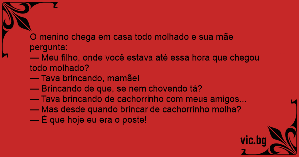O menino chega em casa todo molhado e sua mãe pergunta: — Meu filho, onde você estava até essa hоrа que chegou todo molhado? — Tava brincando, mamãe! — Brincando de que, se nem chovendo tá? — Tava brincando de cachorrinho com meus amigos... — Mas desde quando brincar de cachorrinho molha? — É que hoje eu era o poste!