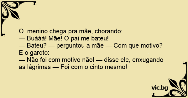 — Não foi com motivo não! — disse ele, enxugando as lágrimas — Foi com o cinto mesmo!