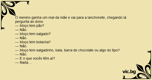 O menino ganha um real da mãe e vai para a lanchonete, chegando lá pergunta ao dono.