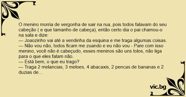 O menino morria de vergonha de sair na rua, pois todos falavam do seu cabeção ( e que tamanho de cabeça), então certo dia o pai chamou-o na sala e dize:
