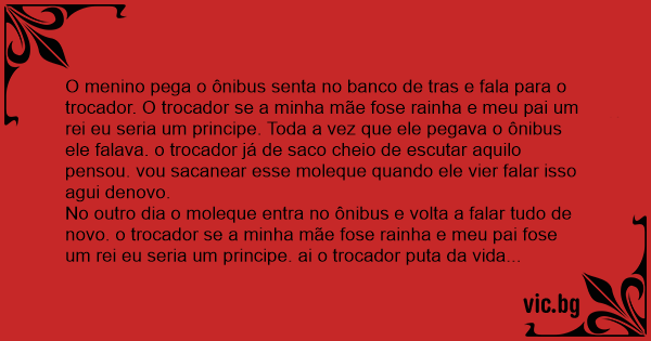 O menino pega o ônibus senta no banco de tras e fala para o trocador. O trocador se a minha mãe fose rainha e meu pai um rei eu seria um principe. Toda a vez que ele pegava o ônibus ele falava. o trocador já de saco cheio de escutar aquilo pensou. vou sacanear esse moleque quando ele vier falar isso agui denovo.