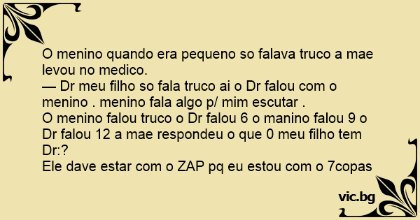 O menino falou truco o Dr falou 6 o manino falou 9 o Dr falou 12 a mae respondeu o que 0 meu filho tem Dr:?