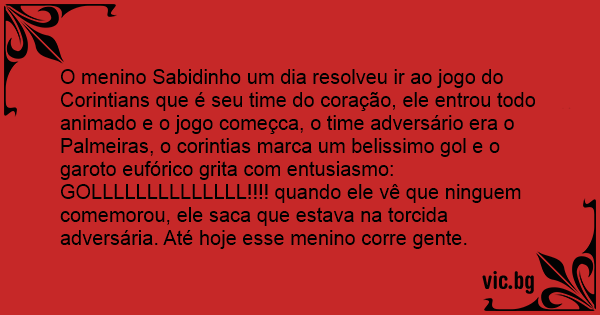 O menino Sabidinho um dia resolveu ir ao jogo do Corintians que é seu time do coração, ele entrou todo animado e o jogo começca, o time adversário era o Palmeiras, o corintias marca um belissimo gol e o garoto eufórico grita com entusiasmo: GOLLLLLLLLLLLLLL!!!! quando ele vê que ninguem comemorou, ele saca que estava na torcida adversária. Até hoje esse menino corre gente.