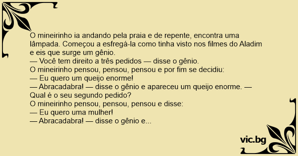 O mineirinho ia andando pela praia e de repente, encontra uma lâmpada. Começou a esfregá-la como tinha visto nos filmes do Aladim e eis que surge um gênio.