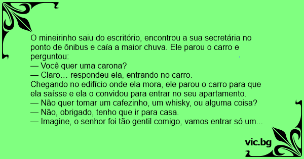 O mineirinho saiu do escritório, encontrou a sua secretária no ponto de ônibus e caía a maior chuva. Ele parou o carro e perguntou: