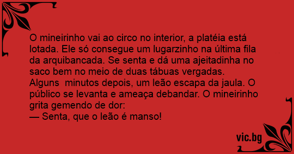 O mineirinho vai ao circo no interior, a platéia está lotada. Ele só consegue um lugarzinho na última fila da arquibancada. Se senta e dá uma ajeitadinha no saco bem no meio de duas tábuas vergadas.