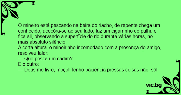 O mineiro está pescando na beira do riacho, de repente chega um conhecido, acocóra-se ao seu lado, faz um cigarrinho de palha e fiса ali, observando a superfície do rio durante várias horas, no mais absoluto silêncio.