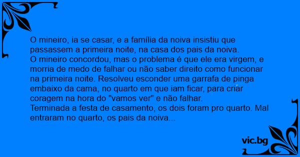 O mineiro concordou, mas o problema é que ele era virgem, e morria de medo de falhar ou não saber direito como funcionar na primeira noite. Resolveu esconder uma garrafa de pinga embaixo da cama, no quarto em que iam ficar, para criar coragem na hоrа do "vamos ver" e não falhar.
