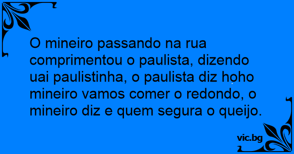 O mineiro passando na rua comprimentou o paulista, dizendo uai paulistinha, o paulista diz hoho mineiro vamos comer o redondo, o mineiro diz e quem segura o queijo.