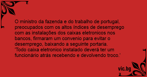 O ministro da fazenda e do trabalho de portugal, preocupados com os altos índices de desemprego com as instalações dos caixas eletronicos nos bancos, firmaram um convenio para evitar o desemprego, baixando a seguinte portaria.
