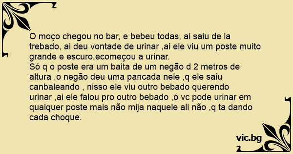 O moço chegou no bar, e bebeu todas, ai saiu de la trebado, ai deu vontade de urinar ,ai ele viu um poste muito grande e escuro,ecomeçou a urinar.