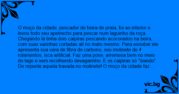Chegando lá tinha dois caipiras pescando acocorados na beira, com suas varinhas cortadas alí no mato mesmo. Para esnobar ele apresenta sua vara de fibra de carbono, seu molinete de 4 rolamentos, isca artificial. Faz uma pose, arremesa bem no meio do lago e vem recolhendo devagarinho. E os caipiras só "óiando".