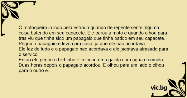 O motoqueiro ia indo pela estrada quando de repente sente alguma coisa batendo em seu capacete. Ele parou a moto e quando olhou para tras viu que tinha sido um papagaio que tinha batido em seu capacete. Pegou o papagaio e levou pra casa, ja que ele nao acordava.