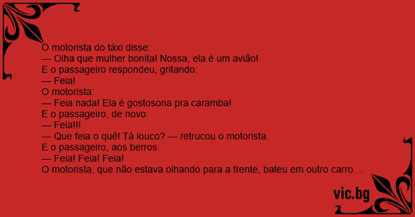 — Que feia o quê! Tá louco? — retrucou o motorista.