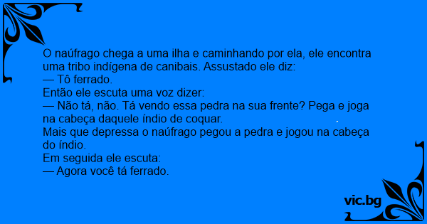 O naúfrago chega a uma ilha e caminhando por ela, ele encontra uma tribo indígena de canibais. Assustado ele diz: