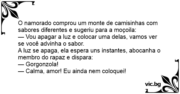 O sujeito estava doido para que a nova namorada lhe fizesse sexo oral e resolve ser criativo. — Meu amor — diz ele, logo que chegaram ao motel. — Hoje eu comprei umas camisinhas com sabor... você...
