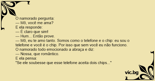 — Mô, eu te amo tanto. Somos como o telefone e o chip: eu sou o telefone e você é o chip. Por isso que sem você eu não funciono.