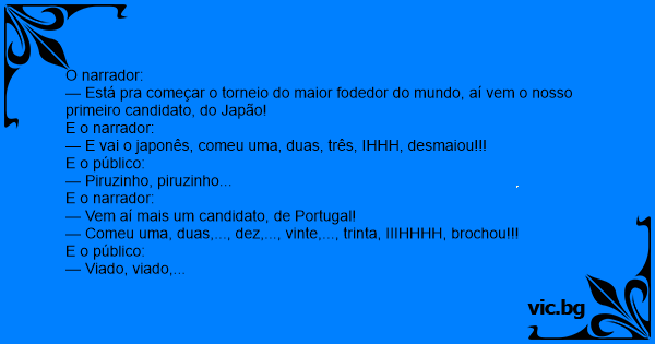 — Está pra começar o torneio do maior fodedor do mundo, aí vem o nosso primeiro candidato, do Japão!