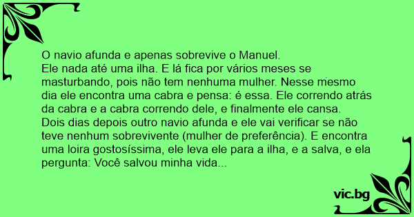 Ele nada até uma ilha. E lá fiса por vários meses se masturbando, pois não tem nenhuma mulher. Nesse mesmo dia ele encontra uma cabra e pensa: é essa. Ele correndo atrás da cabra e a cabra correndo dele, e finalmente ele cansa.
