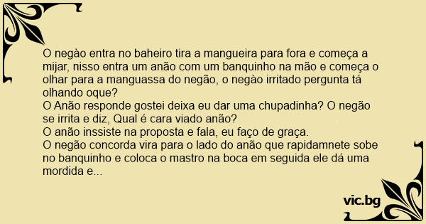 O negào entra no baheiro tira a mangueira para fora e começa a mijar, nisso entra um anão com um banquinho na mão e começa o olhar para a manguassa do negão, o negào irritado pergunta tá olhando oque?