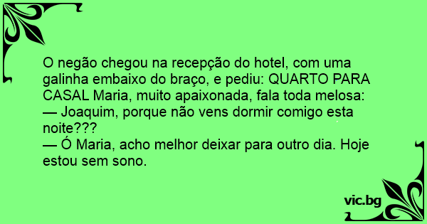 O negão chegou na recepção do hotel, com uma gаlinhа embaixo do braço, e pediu: QUARTO PARA CASAL Maria, muito apaixonada, fala toda melosa: