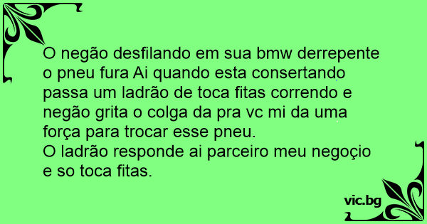O negão desfilando em sua bmw derrepente o pneu fura Ai quando esta consertando passa um ladrão de toca fitas correndo e negão grita o colga da pra vc mi da uma força para trocar esse pneu.