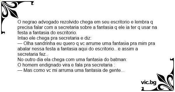 No dia seguinte a secretaria arrumou uma fantasia do batman pra ele... ele todo indgnado repetio as mesmas coisas de antes e ele como a secretaria impacientes foram embora... no dia seguinte o homem chega e pergunta:
