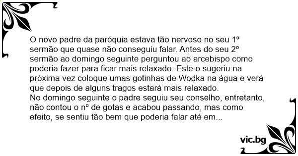 O novo padre da paróquia estava tão nervoso no seu 1º sermão que quase não conseguiu falar. Antes do seu 2º sermão ao domingo seguinte perguntou ao arcebispo como poderia fazer para ficar mais relaxado. Este o sugeriu:na próxima vez coloque umas gotinhas de Wodka na água e verá que depois de alguns tragos estará mais relaxado.