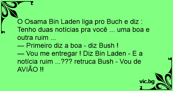 — Vou me entregar ! Diz Bin Laden - E a notícia ruim ...??? retruca Bush - Vou de AVIÃO !!