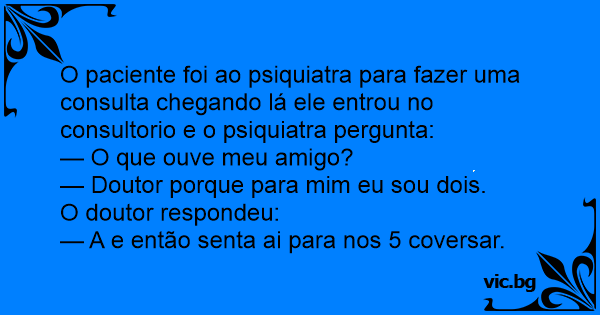 O paciente foi ao psiquiatra para fazer uma consulta chegando lá ele entrou no consultorio e o psiquiatra pergunta: