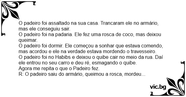 R: O padeiro saiu do armário, queimou a rosca, mordeu a fronha e deu ré no quibe.